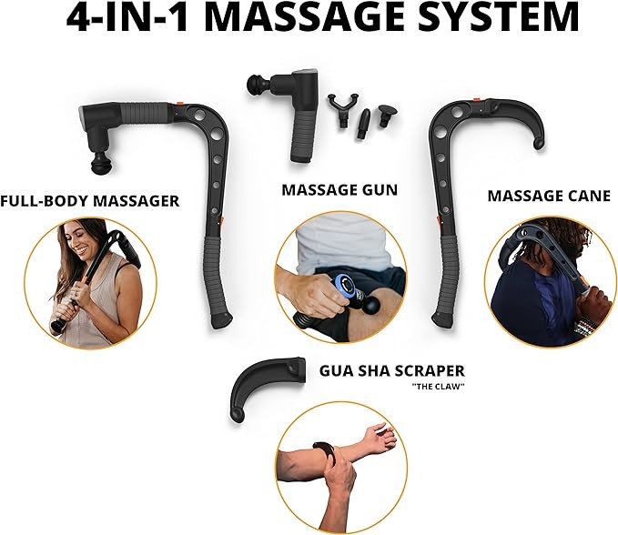 • 4 DIFFERENT TOOLS IN 1 SYSTEM: The modular TALON system comes with: (1) Muscle Massage Gun, (2) Massage Gun Holder, (3) Massage Cane Attachment (aka Massage Hook), and (4) a Gua Sha Muscle Scraper Tool. It also comes with 4 massage head attachments (ball, fork, bullet, and flat), a fast charger, and a carrying bag.
