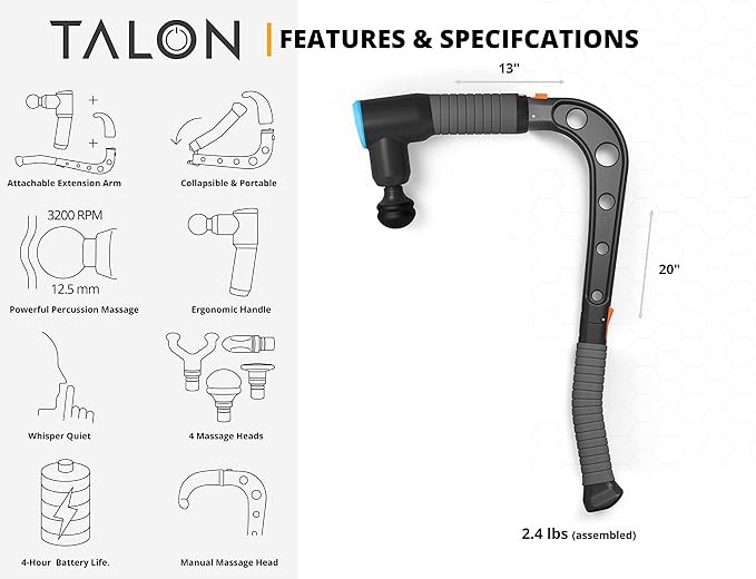• REACH EVERY MUSCLE – EVERYWHERE: Ditch the massage gun wall mount. The extension arm is lightweight, super strong (based on advanced structural modeling) and gives you the freedom to massage anywhere. The arm's patent pending folding design makes it super portable and easy to travel with (along with all the Talon attachments and travel case). Also, it's unique, wrist-saving shape is designed to keep the massage head at the right angle at all times.