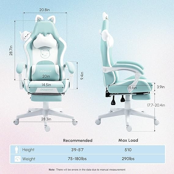 Dowinx Gaming Chair Cute with Cat Ears and Massage Lumbar Support, Ergonomic Computer Chair for Girl with Footrest and Headrest, Comfortable Reclining Game Chair 290lbs for Adult