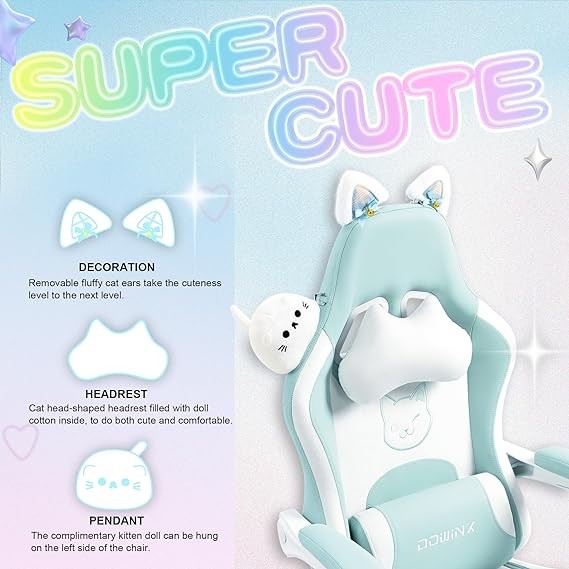 • Next Level Cuteness: What truly sets this gaming chair apart are the endearing cat ears perched on the top corners of the chair's backrest, cat-shaped headrest and cat doll. These whimsical accents add a delightful touch of playfulness and create an instant connection with anyone who lays eyes upon them. The cat ears and doll are removable and can be replaced with your favorite decorations.