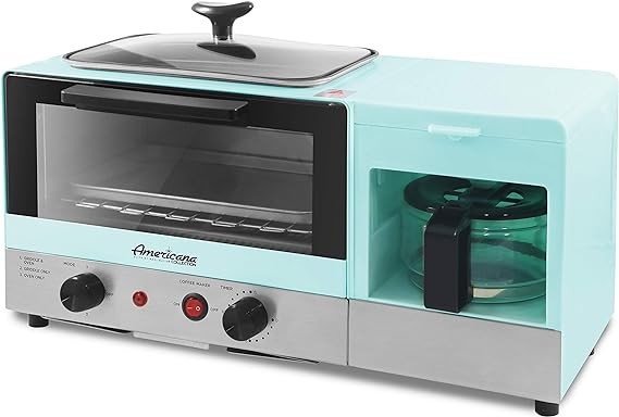Elite Gourmet Americana 2 Slice, 9.5" Griddle with Glass Lid, 3-in-1 Breakfast Center Station, 4-Cup Coffeemaker, Toaster Oven with 15-Min Timer, Heat Selector Mode, Blue