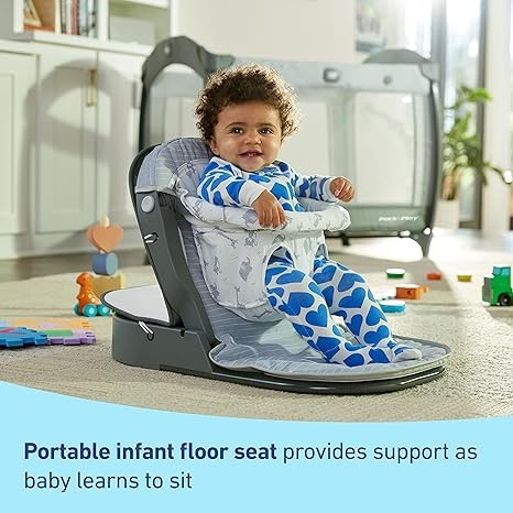 Portable bassinet converts to an infant floor seat and can be used both on or off the playard