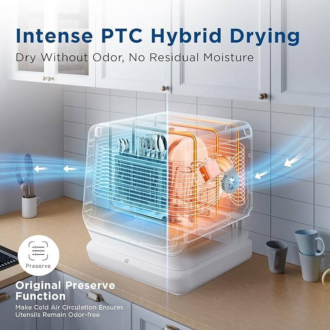 • 【Intense Hybrid Drying &Original Preserve Function】Through hot air circulation, this portable countertop dishwasher ensures your dishes are odor-free and free from residual moisture. Additionally, our original preservation feature activates a cold air circulation system after the hybrid drying regularly, keeping your stored tableware fresh and odor-free.
