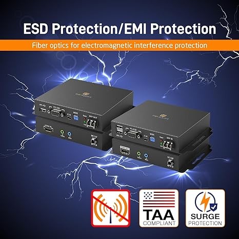 • ⚡【4K60 Over Fiber USB KVM Extender】Experience the ultimate solution for transmitting Ultra HD 4K60Hz video/audio signals over a single-mode fiber optic cable. With a remarkable transmission distance of up to 10KM(32,808ft), this extender supports HDMI 2.0, 4K60Hz 4:4:4 8 bits, HDR 4K60Hz 4:2:0 10bits, 7.1ch surround sound or stereo digital audio, HDCP 2.2, Bi-directional IR and RS-232 pass-through.