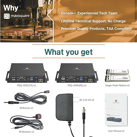 HDMI Over Fiber Optic Extender with KVM USB, HDMI 2.0 4K60Hz 4:4:4, Extend Up to 32, 808ft(10KM), 18Gbps, HDCP2.2, HDR, Two-Way IR, RS232, 2X Single Mode Modules, TAA Compliant (MSQ-300E)