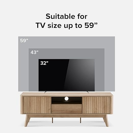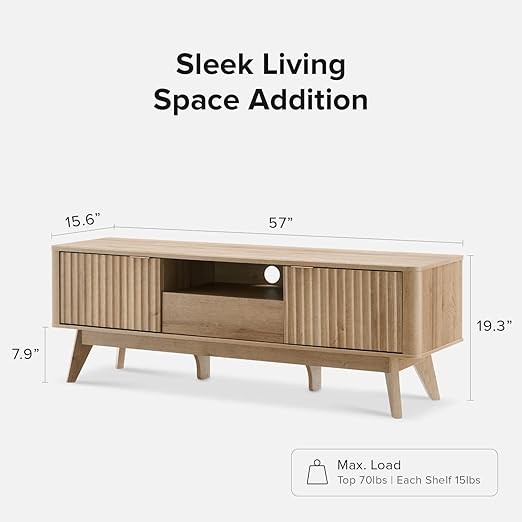 mopio Brooklyn Mid-Century Modern TV Stand, for TVs up to 50” Waveform Panel, Sleek Curved Profile with Adjustable Shelf and Sturdy Box Frame Leg (Golden Oak, 57")