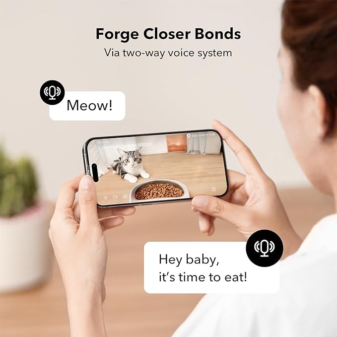 • Two-way Audio & Personalized Meal Call: Built-in advanced microphone and speaker allow you to keep in touch with your pet baby anywhere anytime. Record a voice message (up to 10 seconds) that plays at mealtime, and set the times (0-5) the meal call play, deliver reminders or just send an “I love you”. The old one is deleted when a new voice recording is done. Easily check the food level through the transparent window and add food in time.