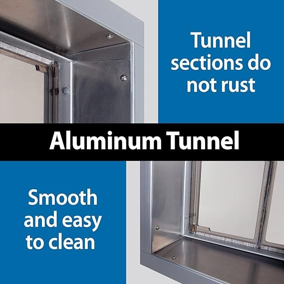Installs into stud, brick, block or cement walls up to twelve inches thick. Heavy duty springs are concealed in the hardened aluminum main frame. Tunnel will not rust, has no sharp edges and is easy to clean. Comes with a lock, a key and a security plate.
