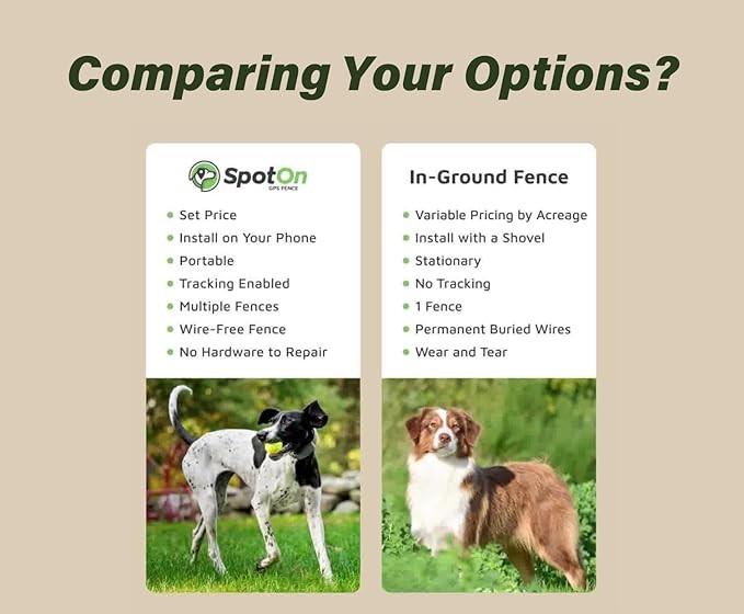 • QUICK SETUP - NO SUBSCRIPTION NEEDED - Set up in minutes & manage from your phone with an easy-to-use app. Train your dog to understand the alerts and tones that are issued by the collar near the fence boundary with the SpotOn Training system - an easy DIY program developed by certified trainers. Customizable feedback with 30 levels of static correction and vibration. Lasts up to 22 hours and can fully recharge in just over one hour.