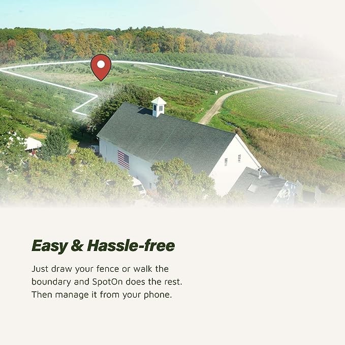 • TRAVEL-FRIENDLY - CUSTOMIZE UP TO 20 FENCES - Create virtual fences of any shape or size with no acreage limits and add Keep Out Zones to off limits areas, without extra hardware or beacons. There are no buried wires or hardware to install so you can make fences at home, on the go, or if you move. SpotOn is the ONLY GPS fence to support overlapping fences, so you can create a large fence for daytime use and a smaller fence for night, or create multiple fences to support rotational grazing.