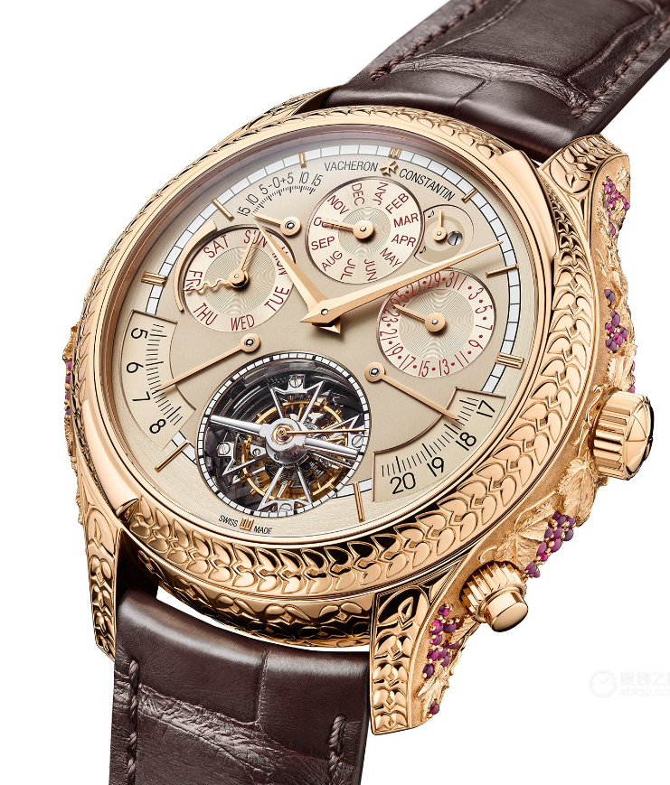 The case is made of 18K 5N pink gold, inlaid with 113 rubies symbolizing grape fruits, with a total weight of approximately 1.84 carats.